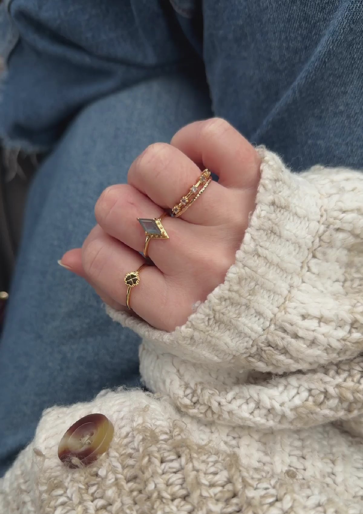 Bague des femmes libres et intuitives, L’Enchanteresse célèbre la puissance subtile de la Labradorite. Protectrice des âmes sensibles, cette pierre irisée agit comme un bouclier énergétique, absorbant les énergies négatives tout en amplifiant votre lumière intérieure. Sa forme losange évoque un talisman ancien, vestige d’un monde oublié où la magie coulait dans les veines des reines guérisseuses.
